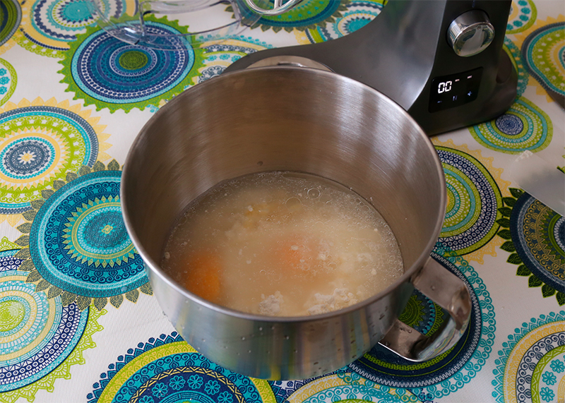 Перемешивающая насадка, 10 секунд на первой скорости, 10 секунд на второй, после чего крутить до готовности на третьей скорости.