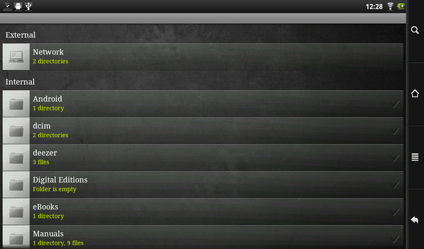 Ну и утилиту Files, которая умеет не только показывать все папки устройства, но и работает с сетевыми папками по UPnP и Samba. У меня она спокойно видела сетевые папки под Windows 7, требовала логин-пароль и потом показывала  содержимое папок.