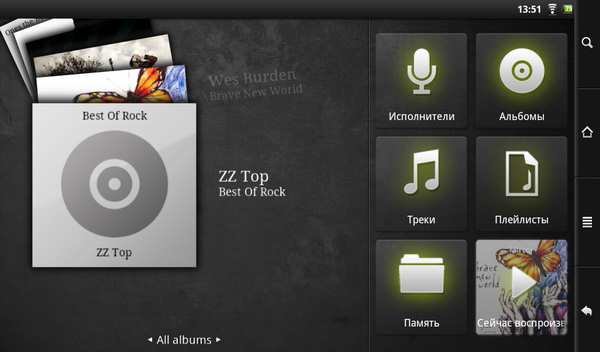 Неплохой музыкальный плеер. Отбор по исполнителям, альбомам, трекам. Поддерживаются плей-листы. Впрочем, при попытке отбора чего-либо планшет тормозит совершенно кошмарно.