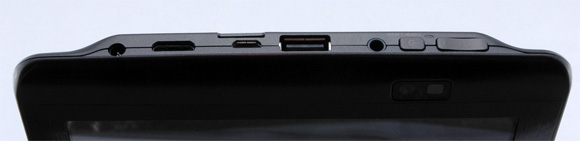 Слева направо: выход адаптера питания, miniHDMI (переходник под обычный HDMI, кстати, в комплект не входит, что чревато дополнительным геморроем по его поиску), слот карты SD, microUSB, USB-хост, выход для наушников, кнопка питания и регулировка громкости.