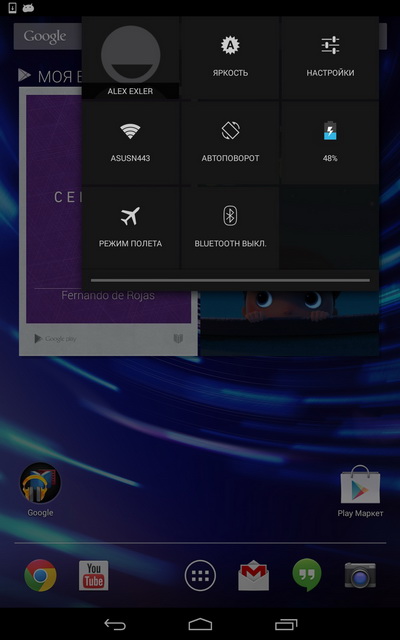 Кстати, вопреки мнению некоторых пользователей даже в версии Android 4.3 нет возможности включить показ процентов заряда батареи - эту возможность, как правило, добавляют в свои прошивки производители флагманских смартфонов-планшетов: Samsung, Sony, HTC и так далее. А тут - чистый Android, так что никаких тебе процентов. Я, чтобы включить эту возможность, использую приложение "Аккумулятор в процентах". (Ну и заодно еще до кучи - "Календарь в строке состояния".)