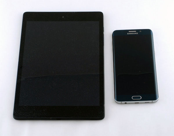 Ну и вот этот планшет рядом с Samsung Galaxy S6 edge+ - просто для сравнения масштабов, ну и чтобы лишний раз поставить ссылку на мой обзор edge+.