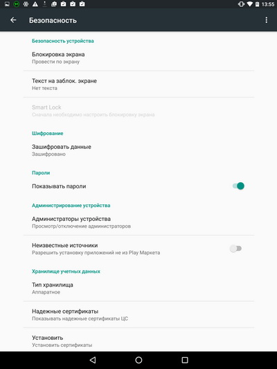 Настройки безопасности. Очень интересная новая возможность (пункт в этом окне ниже) - "Блокировка в приложении". Работает следующим образом. Включаете эту опцию. Далее заходите в нужное приложение (например, в игру, которую нельзя закрывать, чтобы не потерять прогресс), вызываете список текущих задач. Там на последнем приложении будет пиктограмма "Пришпилить". Нажимаете на нее - все, обычным способом из приложения выйти нельзя, а только одновременным нажатием кнопок "Назад" и "Обзор". Также вы можете задать, чтобы при разблокировке приложения выдавался экран блокировки с защитой:  графический ключ, PIN-код или пароль. Таким образом, например, вы можете дать кому-то планшет поработать с приложением, но человек из приложения не сможет никуда выйти - это может пригодиться. И это тоже базовая функциональность Android 6.0.