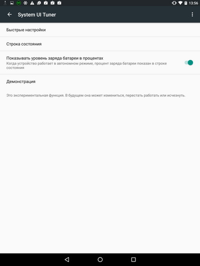 Но для Android 6.0 пока есть одна хитрость, с помощью которой вывод процентов можно включить. Нужно в области уведомлений нажать пальцем на пиктограмму настроек и подержать пиктограмму нажатой продолжительное время - не менее минуты. Через какое-то время пиктограмма задрожит и сообщит вам, что в настройках появился пункт System UI Tuner. Вот там можно включить вывод процентов. Но функция это экспериментальная, и там есть предупреждение, что в будущем это меню может пропасть.