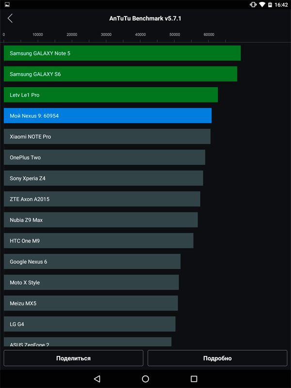 Мое первое впечатление от дисплея было и самым верным – тусклый. Привык пользоваться iPad третьего поколения (где экран ой как далек от идеального) на 70 процентах подсветки, а тут на максимуме все очень грустно. Мне не хватает яркости, а также от этого страдает качество картинки, цвета такие же тусклые, словно пыльные. Чем-то это мне напомнило Motorola XOOM, но он вышел в 2010 году. Взял такой планшет как Galaxy Tab S 8.4 c SuperAMOLED-экраном и максимальной среди всех устройств яркостью. Никакого сравнения, Nexus 9 просто из другой лиги. По экрану он проигрывает почти всем устройствам на рынке, возможно, сравним с бюджетными. На экране тут сэкономили, и очень сильно, правда, возможно и другое объяснение, что большая яркость приводила к дичайшему жору батарейки.
