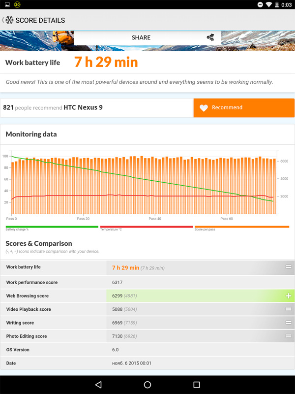 Синтетический тест. На комфортной яркости экрана и с включенными беспроводными видами связи PC Mark провел тест смешанных режимов: серфинг, обработка фото, видео, чтение и так далее - то есть эмуляция хорошей загрузки смартфона различными стандартными действиями. Получилось вот что. Это хороший показатель, плюс по графику видно, что батарея разряжалась очень равномерно.