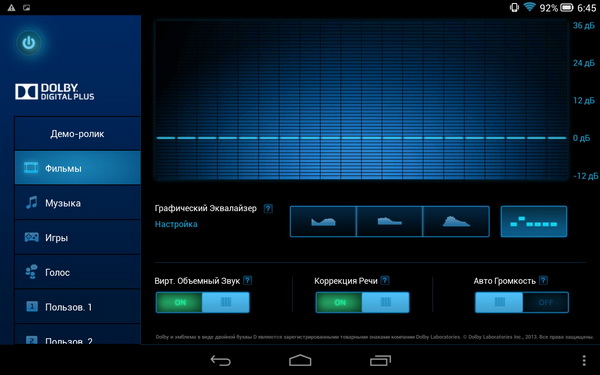 Здесь поддерживается звук Dolby Digital Plus. В данном приложении его можно настраивать под различные виды воспроизведения. И выбор вида медиаданных доступен в стандартных приложениях воспроизведения звука и видео.