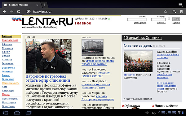 В общем, для планшета время работы, на мой взгляд, очень среднее. Я не говорю про iPad, который тащит под 10 часов видео и часов 11 браузинга в Интернете, но тот же Samsung Galaxy Tab 10.1 устойчиво показывает 8 часов видео (проверял лично) и до 10 часов обычной работы. Здесь - заметно меньше, но, впрочем, и батарейка менее емкая - 5000 мАч против самсунговских 6860 мАч.