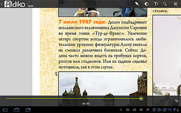 В сравнении с Galaxy Tab 10.1 и iPad 2 мне показалось, что у Sony Tablet S чуть менее глубокие тона черного (они все-таки ближе к темно-коричневому) и есть небольшой уклон в желтую часть спектра, хотя это одновременно делает оттенок более "теплым". (Уклон в синеву-голубизну делает изображение более "холодным".)