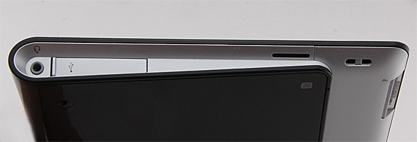 На левом торце - выход аудио 3,5 мм, закрытый специальной заглушкой слот с USB 2.0 micro A/B и слот под SD(HC)-карту. Ниже - левый динамик и загогулина для петельки.