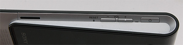 На правом торце: кнопка включения, регулировка громкости, Reset и правый динамик.