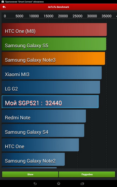 Планшет реально быстрый, недостатка быстродействия на нем я не ощущал. AnTuTu дал ему индекс 32440. (Интересно, что когда я повторил тест через несколько дней, он же дал уже 40188.) "Тяжелые" графические игры шли на нем без каких-либо тормозов.