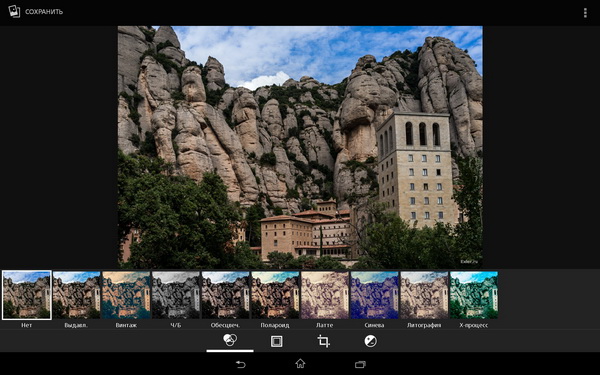 Редактирование изображения: эффекты, рамка, кадрирование, настройки яркости-контраста и других параметров.