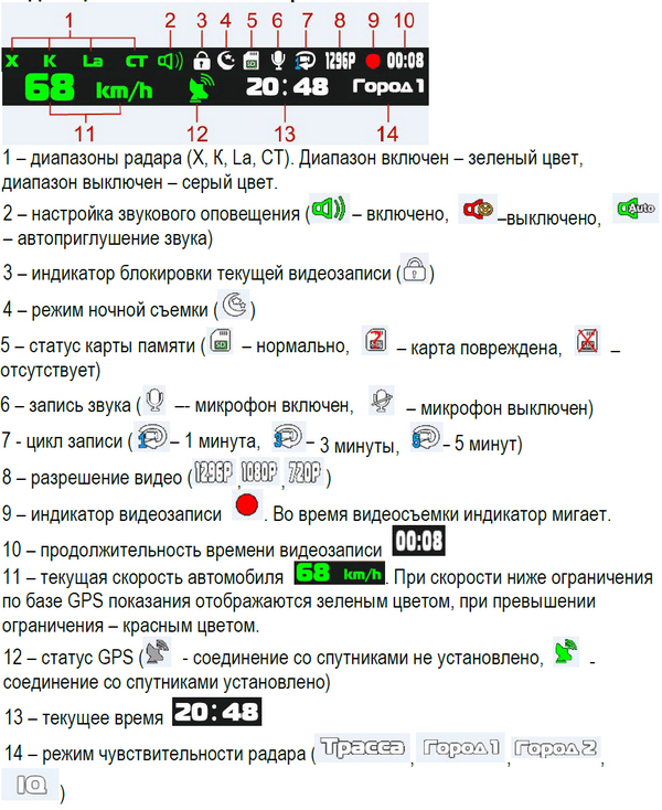 С информированностью здесь все очень здорово (пожалуй, это самый продвинутый видеорегистратор с точки зрения того, какое количество информации он может выводить для водителя), и лучше всего это покажут соответствующие разделы из руководства пользователя.