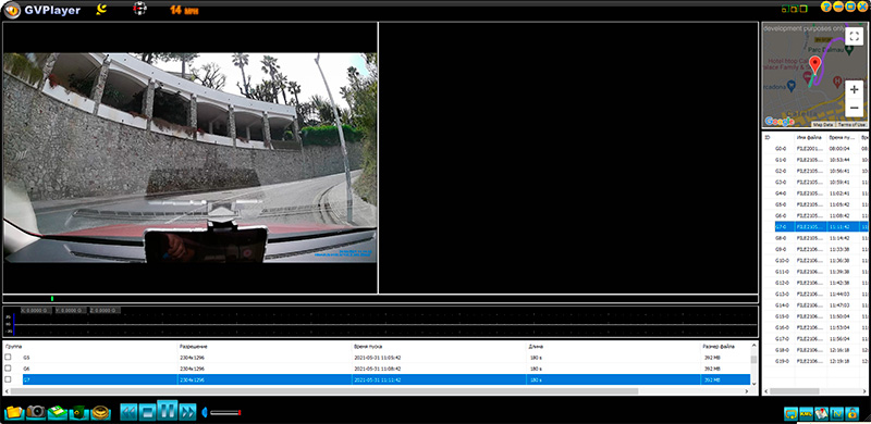 Плеер простенький, но показывает трекинг, может выводить нужную точку через "Карты Гугла" в браузере, также показывает работу G-сенсора и запись со второй камеры (у меня ее нет, поэтому правый квадрат черный).