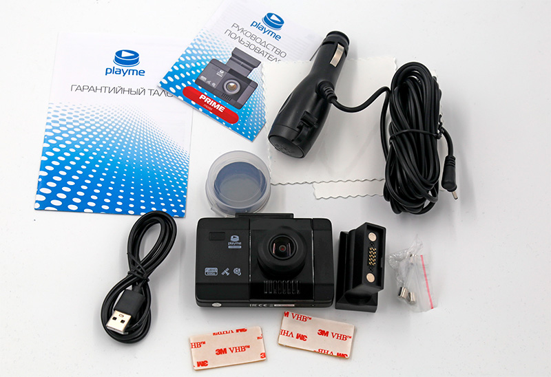 Комплект поставки: видеорегистратор, крепление, кабель USB - miniUSB, кабель питания от прикуривателя, две ленты 3M для крепления, поляризационный фильтр CPL, два предохранителя, две прозрачные плёнки на лобовое стекло (чтобы при необходимости можно было легко снять крепление), руководство пользователя, гарантийный талон.
