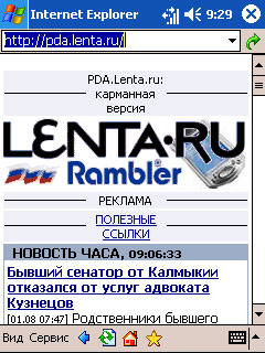 На таком экране (320х240), конечно, полноценные сайты смотреть несколько сложновато, но специальные PDA-версии, которыми снабжено большинство наиболее посещаемых сайтов, вполне читаемы! Например, вот так выглядит Lenta.ru в PDA-версии: