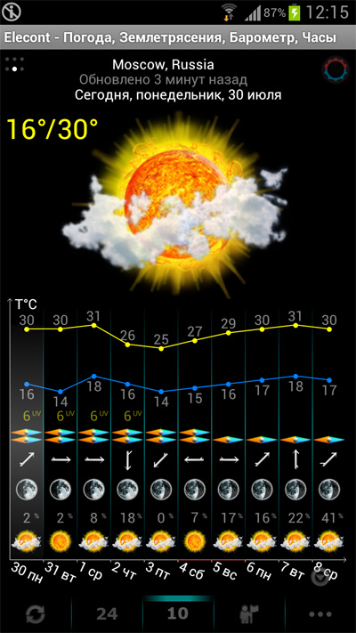 Погода - программа Elecont. Я ее и под iOS использовал, и под Android она есть. Очень удобная и красивая. Одна только проблема: умеет использовать или американский погодный сайт, или Foreca. Более ничего. Однако это не страшно - для прогнозов по России пользуюсь Foreca, для заграницы - американским сайтом.