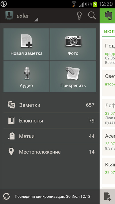 Несколько раз пытался использовать Evernote, но почему-то никак не получается на нее перейти. Хотя вроде должно быть именно то, что мне нужно - всевозможные типы заметок, с удобной организацией, с синхронизацией и доступом отовсюду. Надо наверно еще одну попытку сделать и решить, почему все-таки они мне не подошли. Одно не понравилось точно - слишком большая и тяжелая программа, слишком много функций, многие из которых мне не очень нужны. Еще как-то не понятно, что там с offline доступом к заметкам, хранящимся локально. Вроде должен быть, но читал отзывы, что были проблемы, а в бесплатной Android версии вроде бы вообще нет. Это смущает - я хочу иметь локальную копию своих данных, с неограниченным доступом независимо от наличия Internet. В общем пока пользуюсь обычными текстовыми файлами, которые синхронизируются через Dropbox, а для быстрых временных заметок использую свою apMemo .