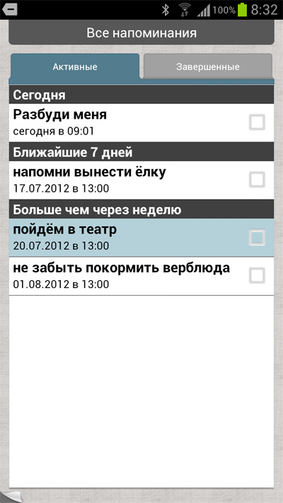 Кроме стандартного календаря Google также использую очень удобную программку "Помнить все", которая умеет работать с голосовыми командами. В ней напоминания можно задавать голосом в свободной форме - ну, например, как просьбы жене: "Разбуди меня через полчасика, во вторник напомни вынести елку, через неделю пойдем в театр, в следующем месяце не забыть помыть верблюда" - и по всем этим просьбам программа создает соответствующие напоминания, которые в нужный момент выводит. (Только для распознавания фраз требуется соединение с Интернетом.) По умолчанию напоминания записываются в саму программу. С гугловским календарем умеет синхронизироваться, но только в платной версии ($2).
