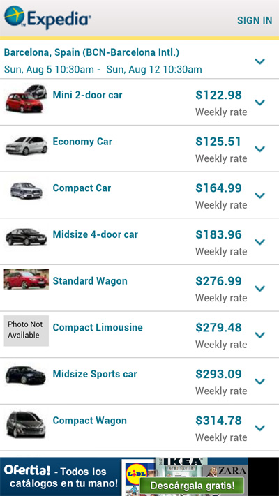 Аренду машин я обычно под Android смотрю через Kayak или Expedia. Последняя, пожалуй, поудобнее.