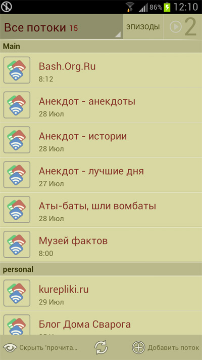 Долго перебирал самые разнообразные программы для работы с RSS-потоками и программы для прослушивания подкастов - в конце концов пришел к выводу, что лучше всего мне подходит BeyondPod Podcat Manager (есть бесплатная версия). Отлично работает с Google Reader (у меня все подписки делаются через него), очень гибко настраивается, удобен в использовании, а главное - так же эффективно, как и с текстами, работает с подкастами, которые поступают через RSS (в том же Google Reader).