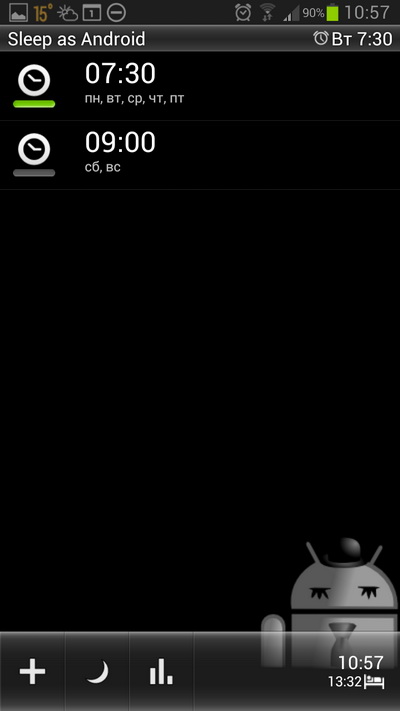 braintunic: Насчет Sleep as Android, она еще умеет ловить храп и с помощью вибрации смартфона убивать этот храп! Очень полезная вещь, когда спишь с подругой или с женой И еще одна возможность - можно настроить самые разнообразные колыбельные мелодии или звуки для тех, кому это помогает заснуть... Но чтобы все это хорошо работало, нужно класть смартфон рядом с собой на матрац, как можно ближе, если он лежит на столе, то не сможет эффективно отслеживать ваши шевеления и вздохи