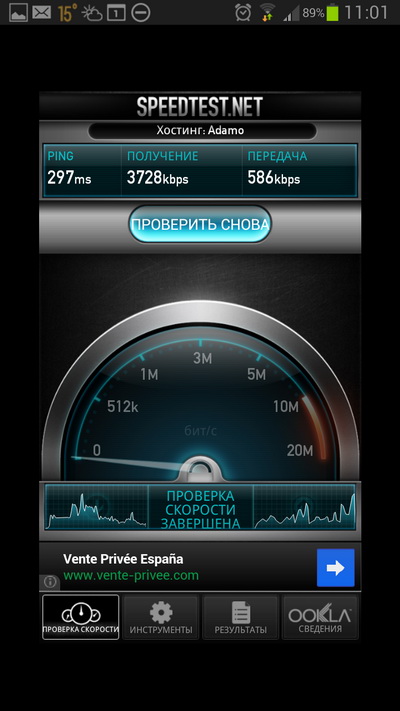 Утилита Speedtest.net Mobile. Красиво и наглядно выдает результаты тестирования интернет-канала.