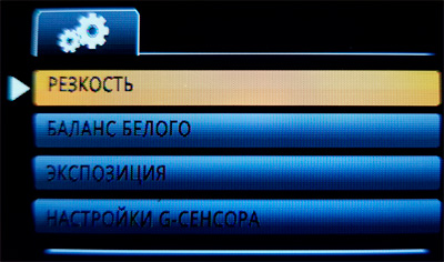 Параметры резкости и контрастности, баланс белого под определенные условия съемки, компенсация экспозиции. Настройка G-сенсора - корректировка чувствительности сенсора (например, чтобы срабатывал именно при чувствительных ударах, а не на каждом ухабе).