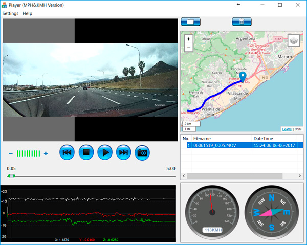 Записанные видеоролики можно просматривать в любом подходящем видеоплеере, однако если вы хотите видеть и координаты поездки, и срабатывание G-сенсора, и другую информацию - тогда для просмотра нужно использовать фирменный плеер, который вы найдете на диске, входящем в комплект (либо же его можно скачать со страницы видеорегистратора).