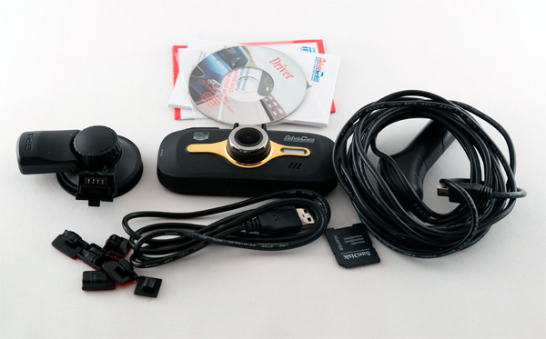Комплект поставки: видеорегистратор, крепление-присоска на лобовое стекло, адаптер питания для прикуривателя, руководство пользователя, карта памяти misroSD 8 ГБ Transcend, диск с программным обеспечение, клипсы для прокладки кабеля.