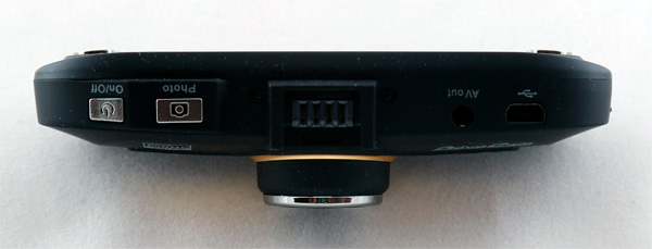 На верхнем торце - кнопка включения-выключения, кнопка фото, посадочное гнездо для крепления на присоске, выход AV, порт miniUSB (питание и сопряжение с компьютером).