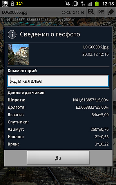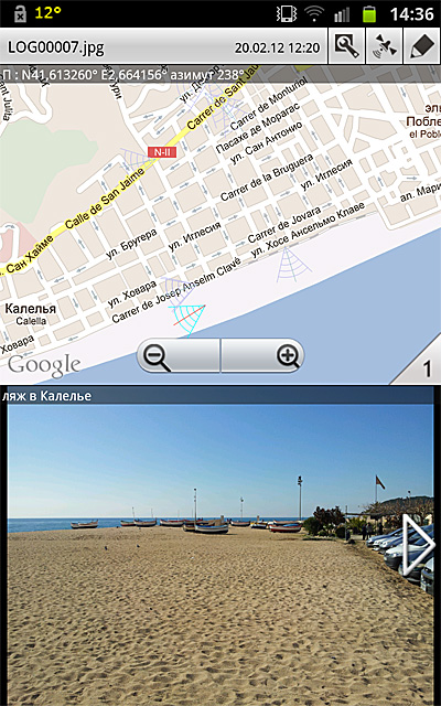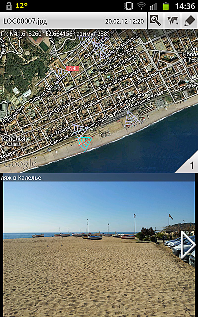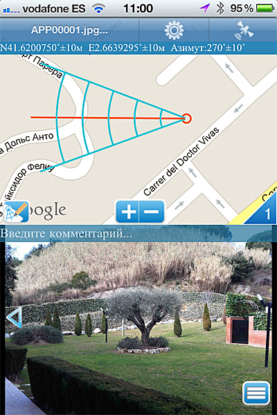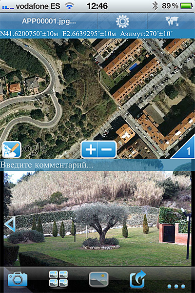 Если нажать на пиктограмму под пиктограммой "затвора", вы увидите сделанный кадр со всеми данными. Снизу идет фото, сверху - кусок карты с углом обзора. Карту можно переключать между режимами спутник-схема.