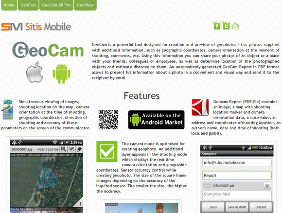 Называется этот сервис GeoCam. У него есть бесплатная и платная версии под Android (бесплатную скачать, платную скачать), а также бесплатная и платная версии под iPhone (бесплатную скачать, платную скачать).