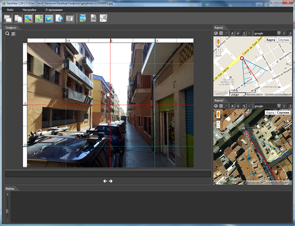 Для получения всех данных по геофото можно использовать и программу под Windows - она называется GeoView (ее можно скачать бесплатно). Программа работает почти так же, как и онлайновая версия: в нее закачиваются геофото (с коммуникатора) и вы можете получить одну-две карты от любого выбранного сервиса любого масштаба (кликабельно).
