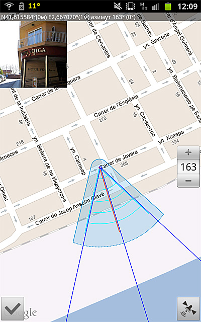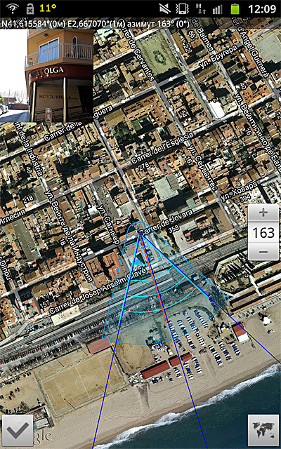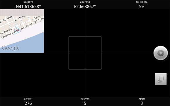 Работает это все следующим образом. Запускаете приложение, появляется режим фотокамеры в следующем виде. На весь экран - изображение с камеры (в скриншот оно не попало) с углом обзора объектива. Слева сверху - кусок карты местности от Google Map. На верхней информационной панели - широта, долгота и точность определения. На нижней информационной панели - параметры угла обзора: азимут, наклон, крен.