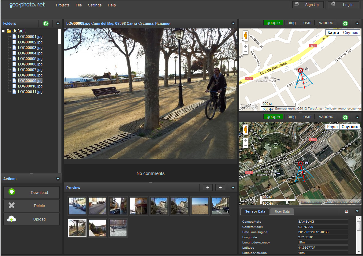 В аккаунте фото распределяются по проектам, по каждой фотографии можно увидеть два изображения карт различных масштабов выбранных сервисов: Google, Bing, Osm, Yandex - при этом доступны варианты отображения этих сервисов. Вот пример по Google (кликабельно).