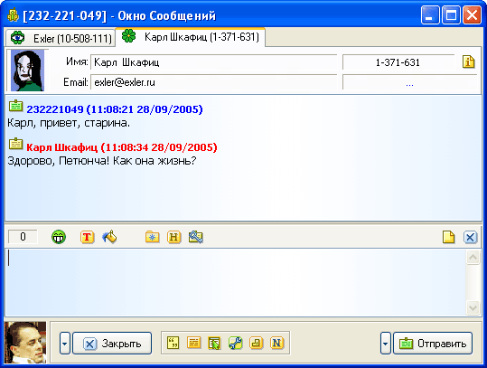 Основное отличие QIP от ICQ заключается в том, что этот мессенджер умеет диалоги с различными абонентами держать в одном окне сообщений - в виде закладок. Поэтому если сейчас начать диалог с еще одним контактом - Карлом Шкафицем, то он появится в этом же окне в виде еще одной закладки: