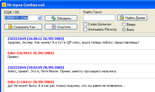 Чем же она удобнее? Во-первых, в отличие от ICQ в QIP сообщения в истории обмена показываются целиком, а не в одну строчку. Во-вторых, по истории реализован нормальный поиск с различными уточнениями (слово целиком, с учетом регистра, с заданием направления поиска). В-третьих, историю можно сохранить в виде отдельного текстового файла, причем экспорт в файл делается вполне корректно (опять-таки в отличие от ICQ). Ну и в-четвертых, прямо в этом окне можно переключать абонентов и получать их историю обмена.