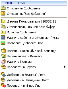 "Скопировать UIN или SN в буфер" - скопировать в системный буфер обмена номер ICQ (или номер мессенджера AIM) данного пользователя. Это может понадобиться, в случае если, например, вам нужно переслать еще кому-то номер данного пользователя.