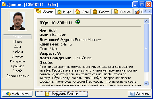 "Данные Пользователя" - вызов личных данных пользователя, которые он опубликовал в базе ICQ: