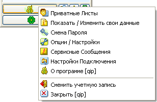 Основное меню QIP появляется при нажатии большой кнопки, расположенной в главной панели программы над кнопкой статуса.