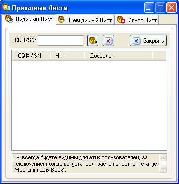 Вы можете добавлять абонентов в эти списки как при помощи рассмотренного чуть выше меню контактов, так и прямо в этом окне - для этого достаточно ввести соответствующий UIN (QIP проверит, существует ли он в базе ICQ) и нажать пиктограмму "Добавить" (справа от строки "ICQ#/SN").