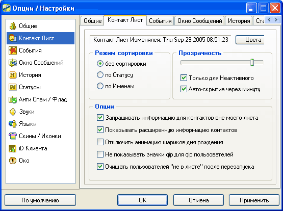 "Прозрачность" - вы можете задать уровень прозрачности панели QIP (только для Windows XP) и выбрать, все время она должна быть частично прозрачной или же только в момент неактивности панели (мне больше нравится делать панель почти прозрачной в момент неактивности, но кто его знает, какие у вас будут предпочтения) - опция "Только для Неактивного".
