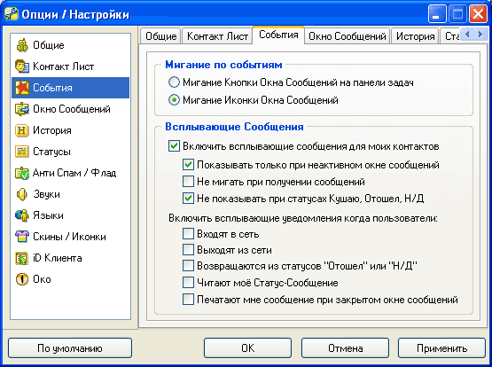 "Мигания по событиям" - здесь можно выбрать, какой элемент будет мигать при поступлении некоего события: кнопка на панели задач или иконка в системной области уведомлений. Обычно выбирают иконку в системной области уведомлений.
