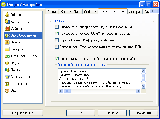 "Готовые Ответы" - в этом поле вы можете отредактировать или ввести новые готовые сообщения. Их количество, насколько я понял, неограниченно. Также неограниченна длина сообщения - оно может быть очень длинным. Готовые ответы - это очень удобная возможность, и в ICQ ее весьма не хватает.
