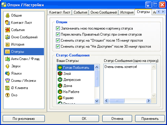 Так что специфические для QIP статусы - "Злой", "Депрессия" и так далее - лучше не включать, потому что подавляющее большинство пользователей ICQ их просто не увидят: вместо этого будет установлен стандартный статус "В сети".