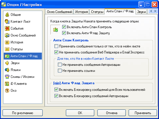 Антиспам-контроль в QIP аналогичен ICQ. Антифлуд-контроль работает точно так же, как и в ICQ (там тоже есть опция не принимать сообщения, отправленные сразу нескольким пользователям, - обычно это признак спама), только называется по-другому.
