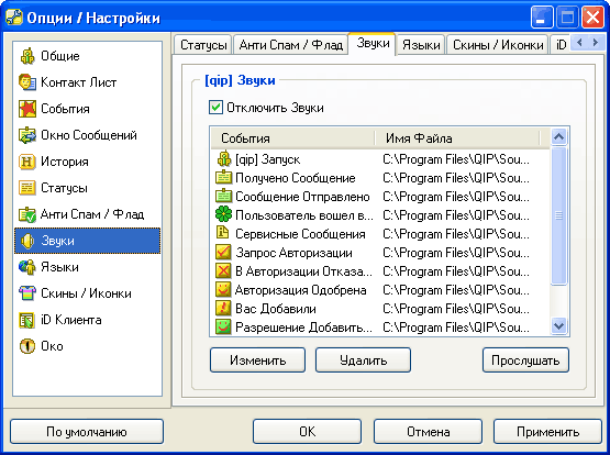 Здесь можно вообще отключить звуки, издаваемые программой, а можно задать звук для каждого системного события. Что интересно, по умолчанию задаются точно такие же звуки, как и в ICQ (кроме звука запуска программы).