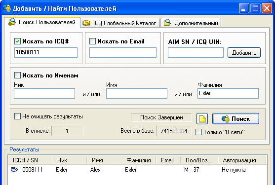 (Кстати, в этом поиске выводится статистика об общем количестве записей в базе. Из нее следует, что в настоящий момент в базе ICQ содержится информация о 741 539 864 пользователях (чуть более семисот сорока миллионов). Впрочем, туда включены и мертвые регистрации, а их весьма много.)